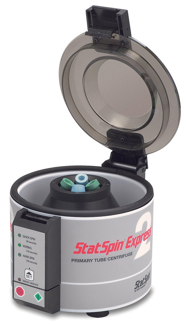 The StatSpin® Express 2 Centrifuge (Manufacturer #SSX2) is engineered for rapid sample processing in clinical and laboratory environments. With a fixed angle rotor and speeds up to 8,500 RPM (4,440 x g), it is optimized for separating small blood collection tubes quickly and efficiently.